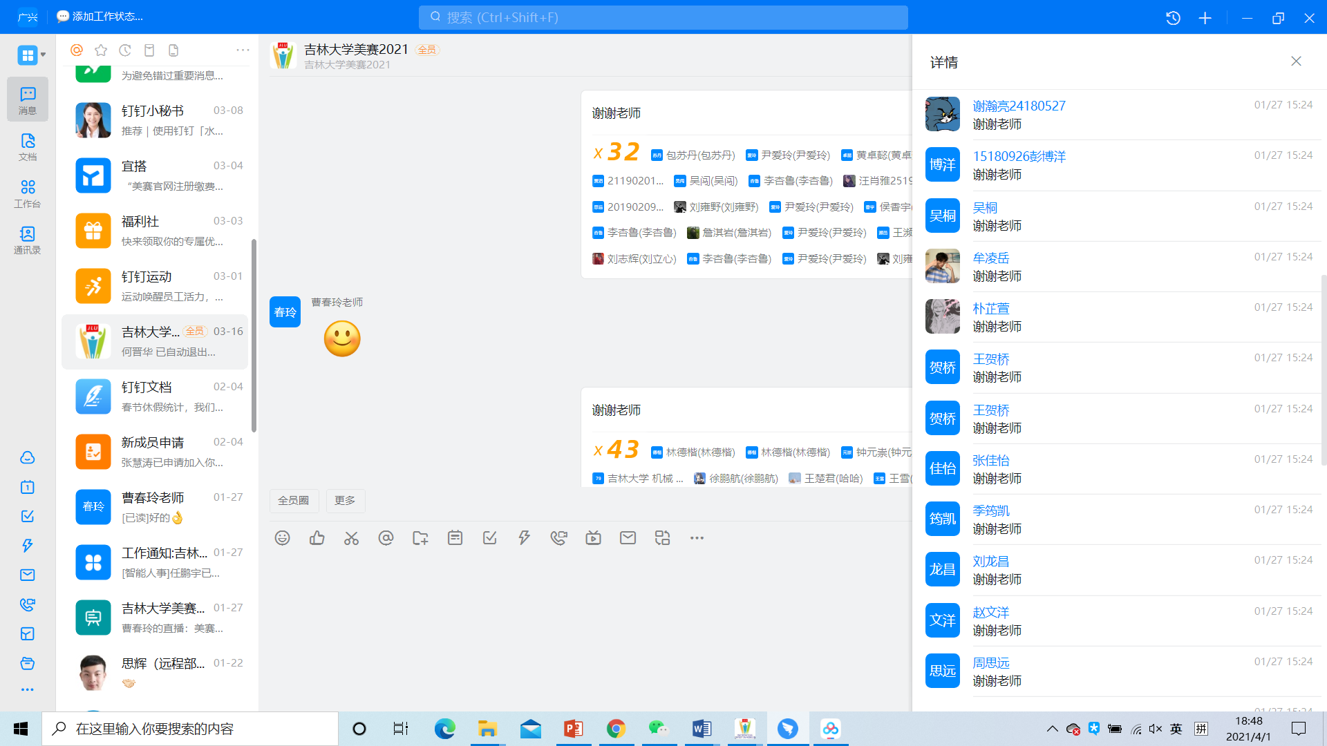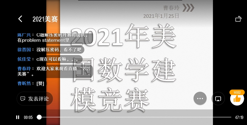 最后,曹老师预祝大家在接下来的正式比赛中取得优异成绩,参与活动的同学们则通过直播群留言向主讲老师表达了诚挚的感谢,线上讲座活动圆满落下帷幕。