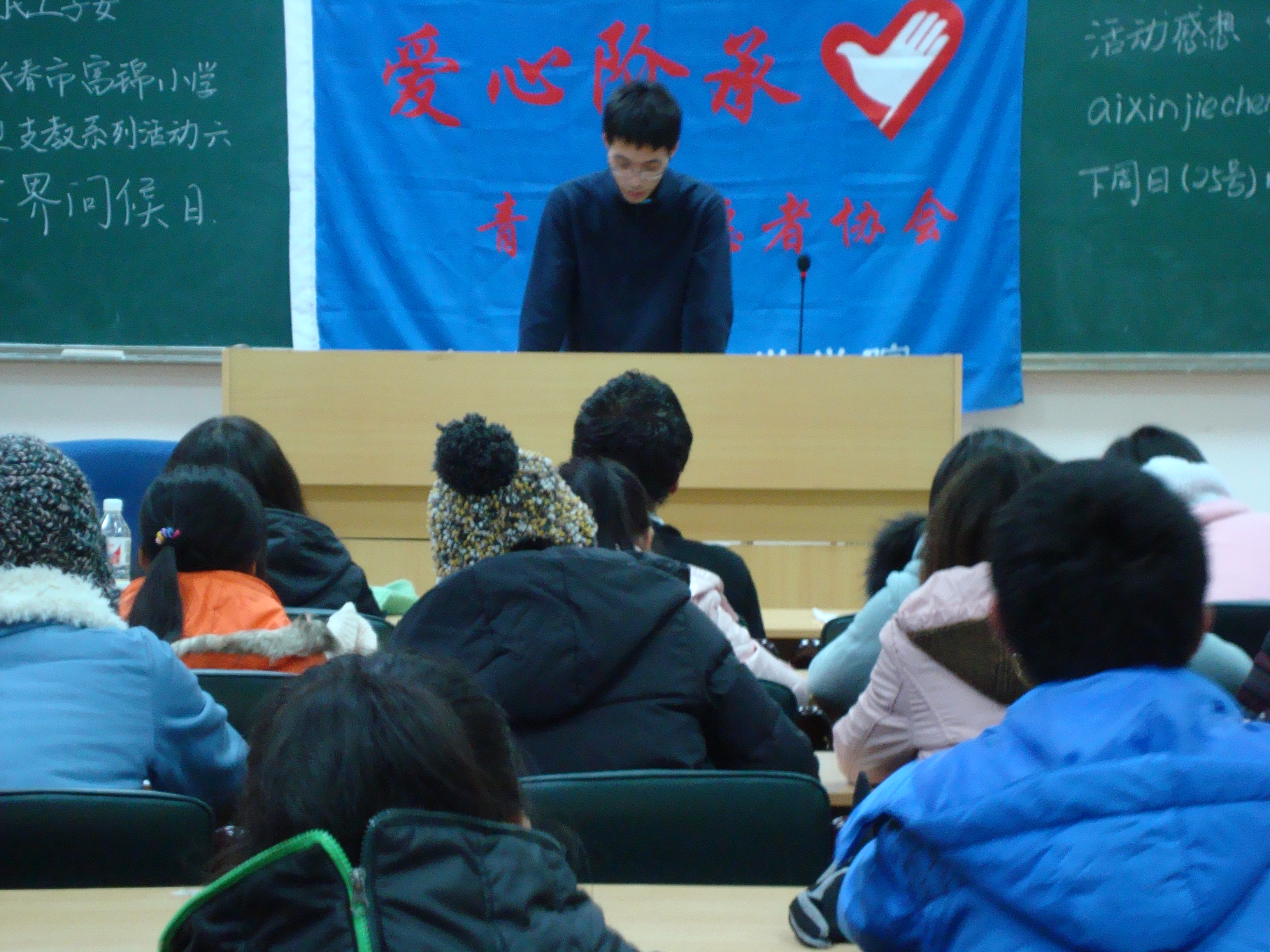 2012年11月15日晚6点,365英国上市公司爱心阶承青年志愿者协会在数学楼一楼报告厅举办了“走进长春市富锦小学--大型支教活动”系列之第六届“世界问候日”主题活动的志愿者培训。