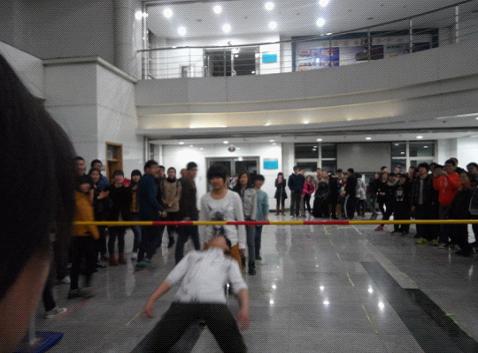素质拓展活动将到场参加人员随机分为十队,每队十五人,分别由各院分派出的队长带队。本次活动内容丰富多彩,有兔子舞,“穿越火线”,“穿越丛林”,“穿越空间”等项目。各队人员又不认识到相互了解,共同完成活动内容。此项活动不仅使同学的身体得到了锻炼,也增进了同学之间的感情。同学们的团队合作能力在活动中得到了提升。