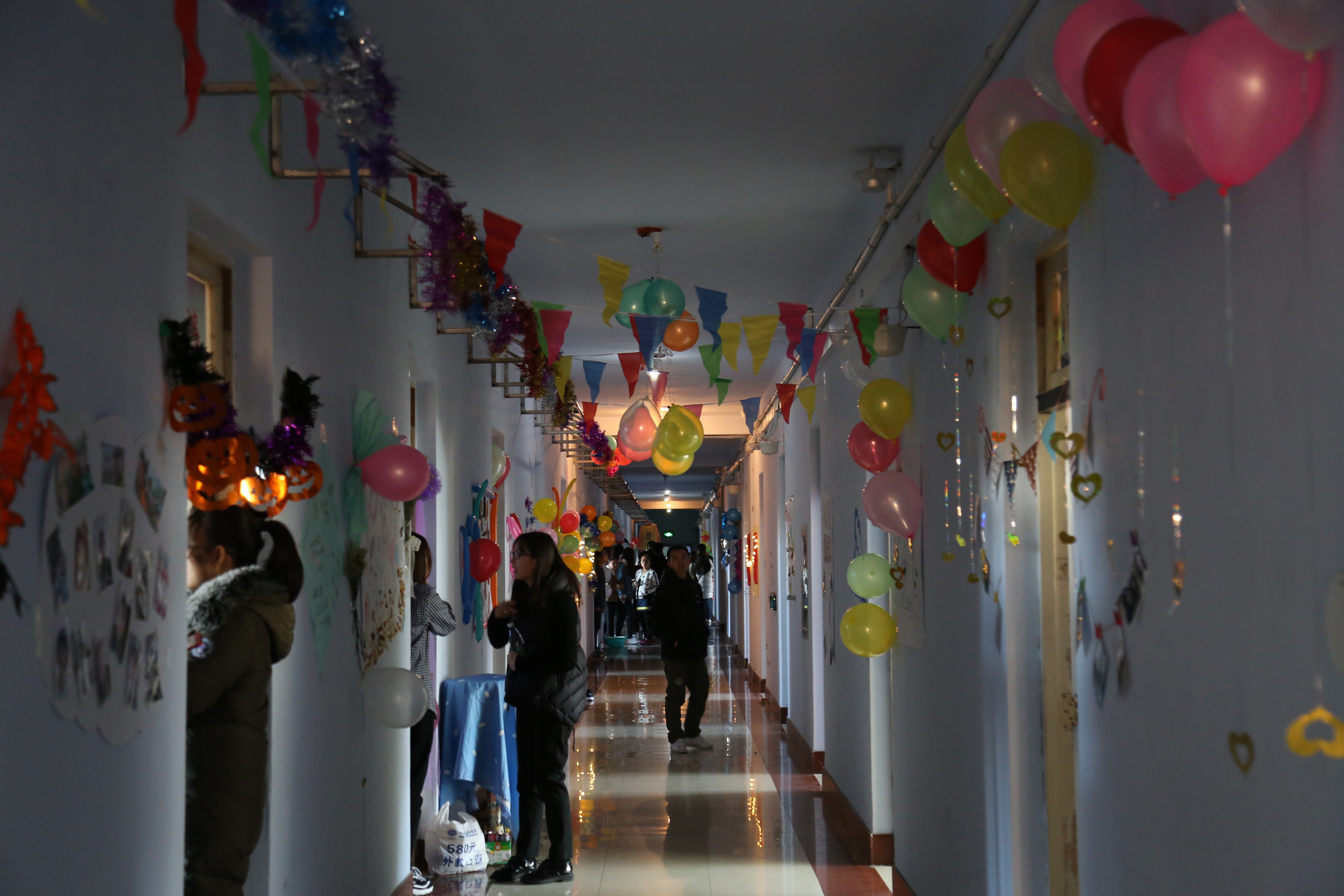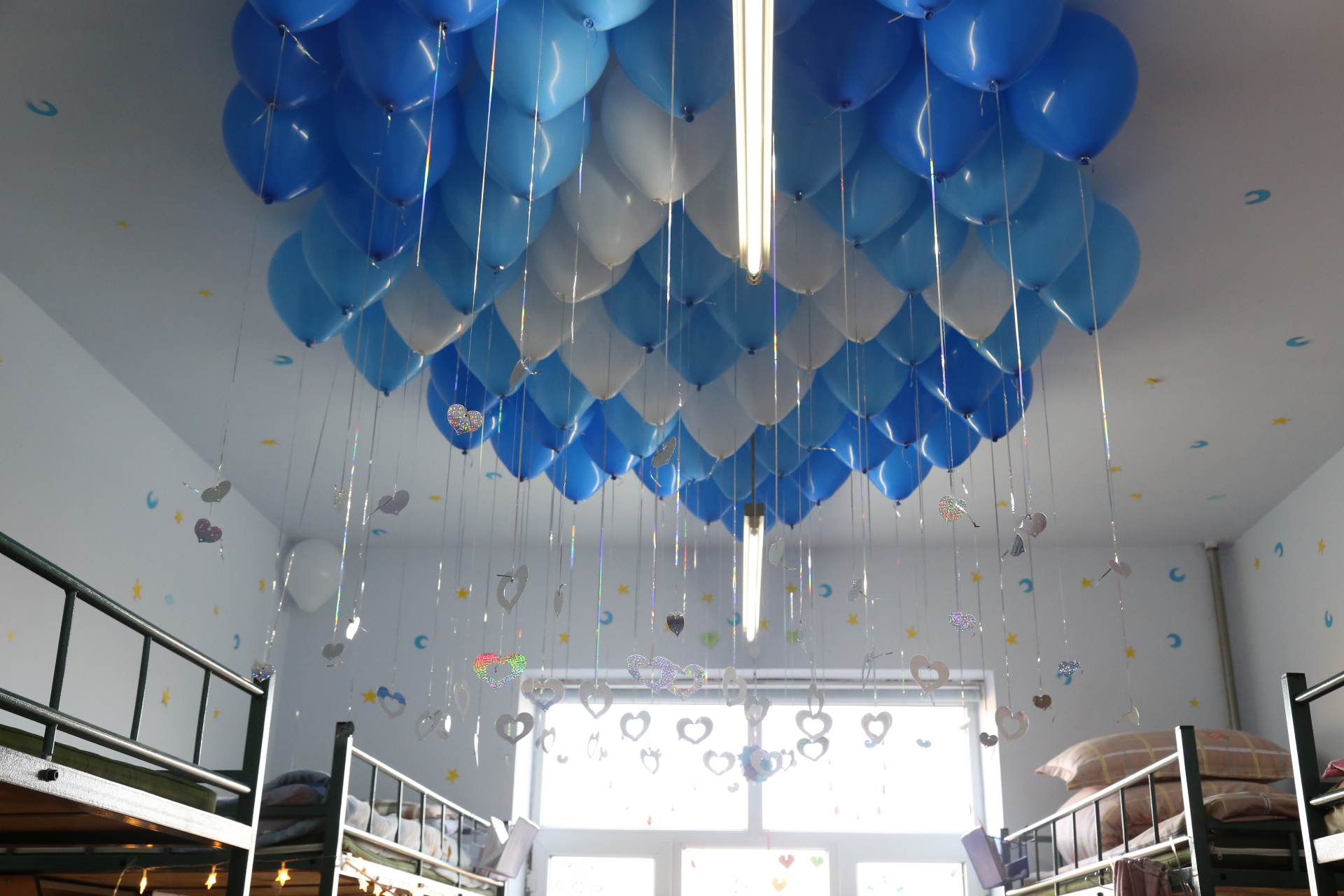 ,有的寝室将气球贴满了天花板,在阳光的影射下显得格外闪耀,有的寝室把千纸鹤串起来,做成了船的形状,高高挂起,也是一道亮丽的风景线。大部分寝室还表演了节目,同学们弹着吉他唱着歌,放着音乐伴着舞,气氛火热,大家都兴致盎然。