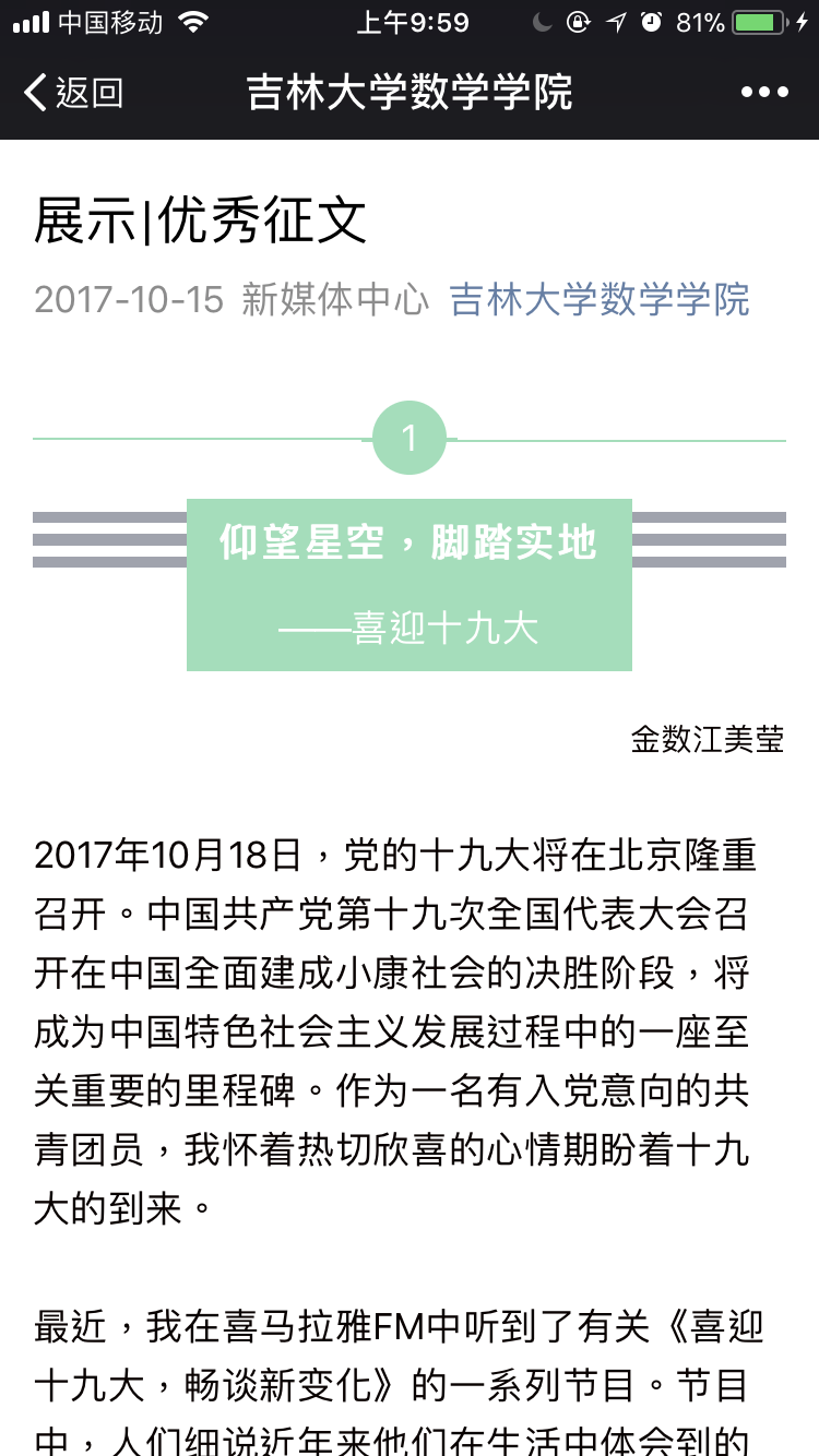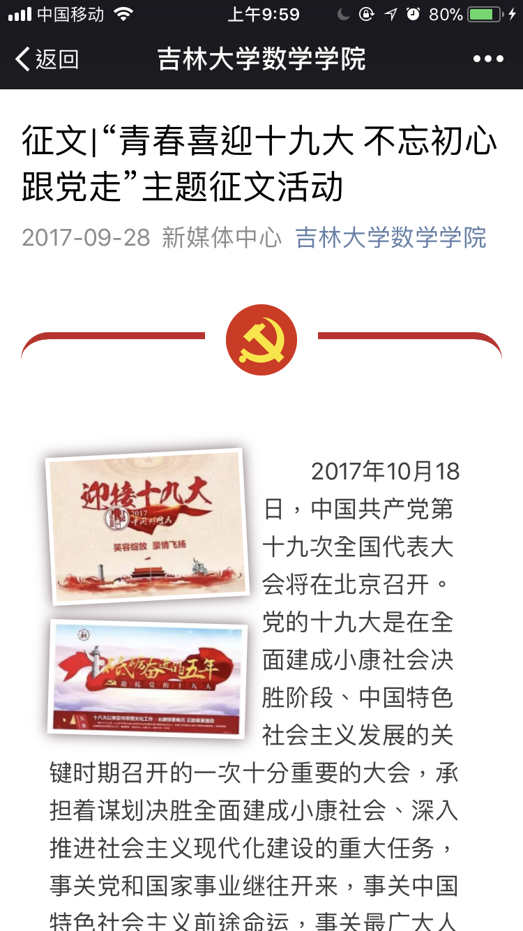 为迎接十九大的召开,365英国上市公司团委社会实践部于九月二十九日至十月九日举办了“青春喜迎十九大 不忘初心跟党走”主题征文活动。