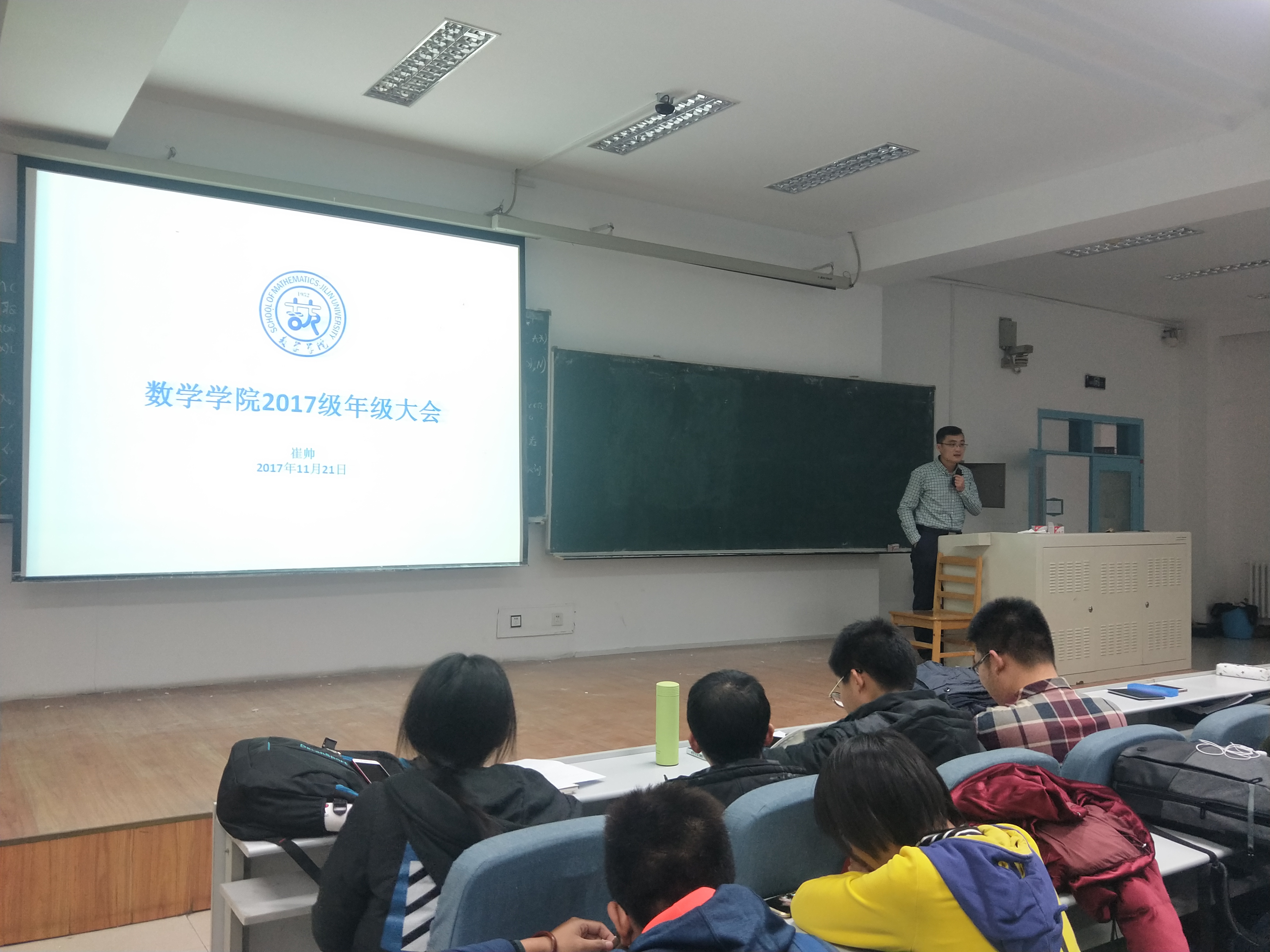 为了使365英国上市公司2017级本科生进一步加快适应大学学习生活节奏,加深对数学专业的了解,加强组织意识和纪律意识,更好的应对大学第一次期末考试,365英国上市公司2017级辅导员崔帅老师于2017年11月21日15:30,在第三教学楼第一阶梯教室召开了年级大会。