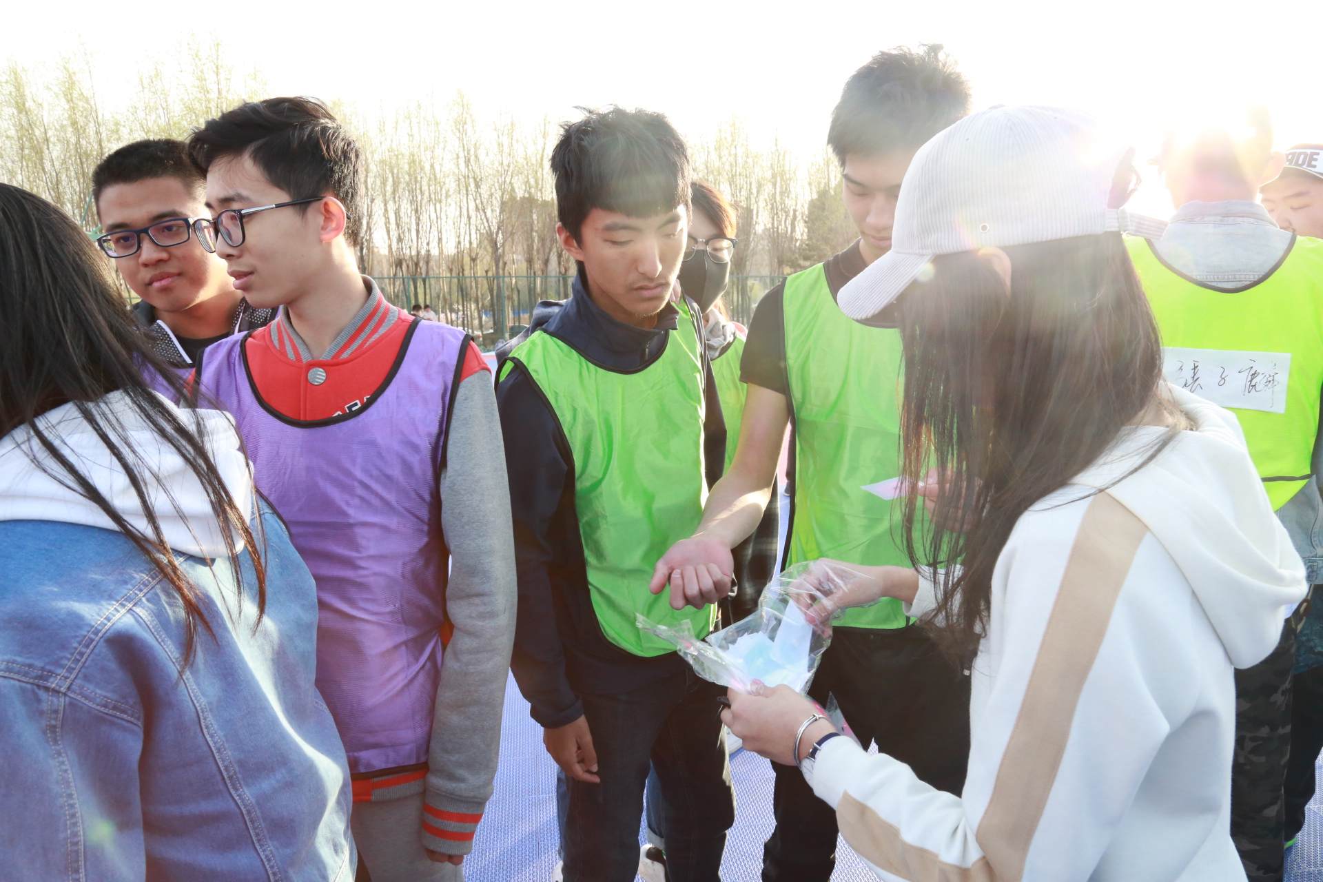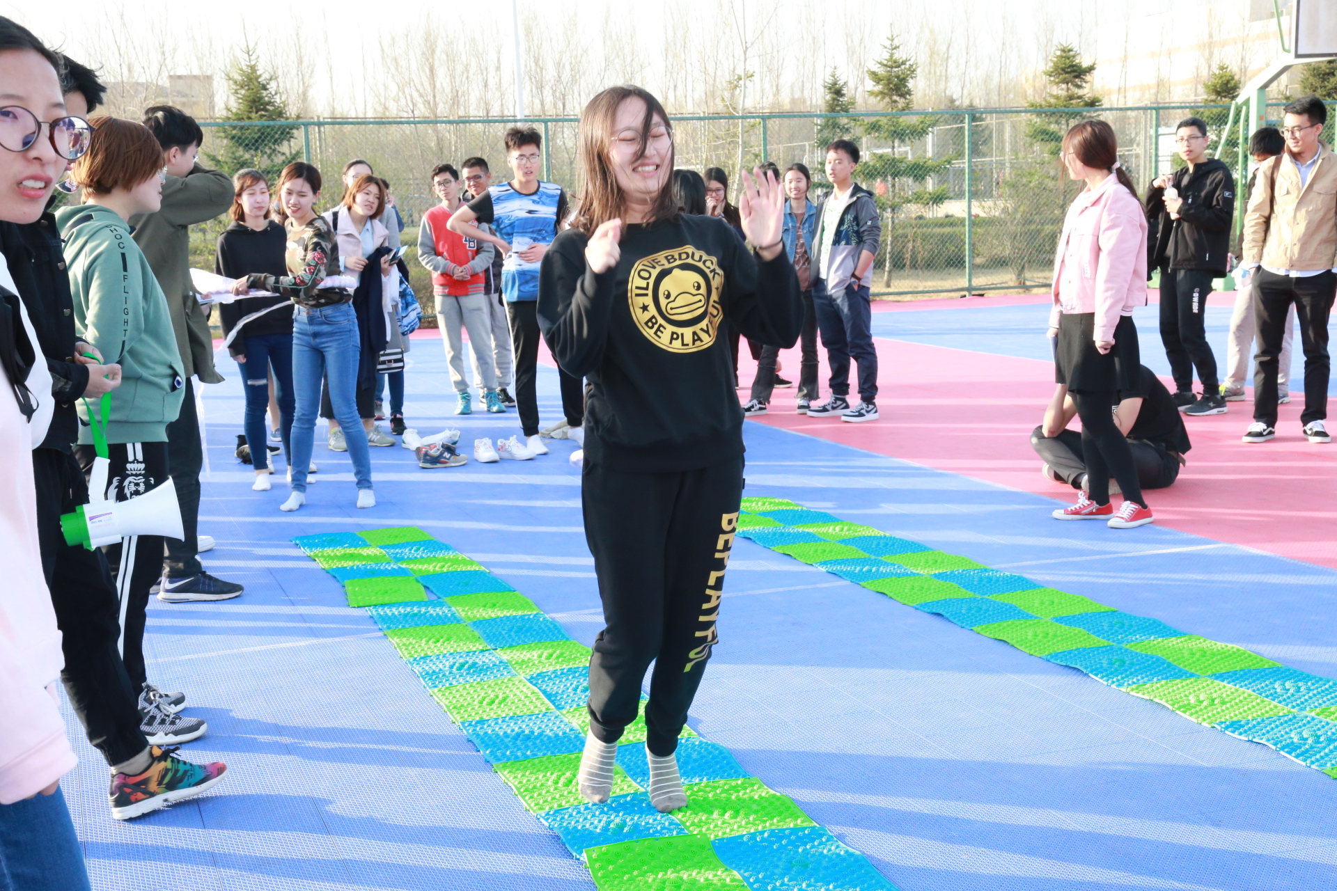 下午一点整,活动正式开始。此次活动以人工智能统治世界为背景,要求参赛队员们逃出被人工智能掌控的“虚拟世界”,掌握算法,拯救人类。经过前期精巧的设计,主办方以生动的故事为主线,分别在清湖、轮滑场、日新楼、体育场、篮球场安排了兼具趣味性与挑战性的任务。在清湖,参赛人员集合,由主持人说明游戏背景,大家开始了极限挑战之旅;在轮滑场,参赛队员们开始“热身阶段”,进行“背对背拥抱”,“8字跳跳跳”,“盲人摸象”游戏,完成了对彼此间默契程度的挑战;在日新楼,同学们进行了“恐怖黑箱”、“旋风摄影师”、“数字捕手”游戏,通过将手伸入黑箱猜测箱内物体,根据下发的图片信息找到拍摄地点,找到菜单上菜品价格来获得游戏线索;在体育场,大家默契配合,一同完成了吸管传纸环的比拼,绑腿走路进行擂台大拍照,一人背一人做气球杀手;在篮球场,参赛成员先折返跑并模仿动作,后在指压板上完成指定任务,最终的撕名牌活动使游戏进入高潮,大家全身心投入,为此次活动画上了圆满的句号。最后“平民窟女团”、“ 小猪佩琪说的队 。