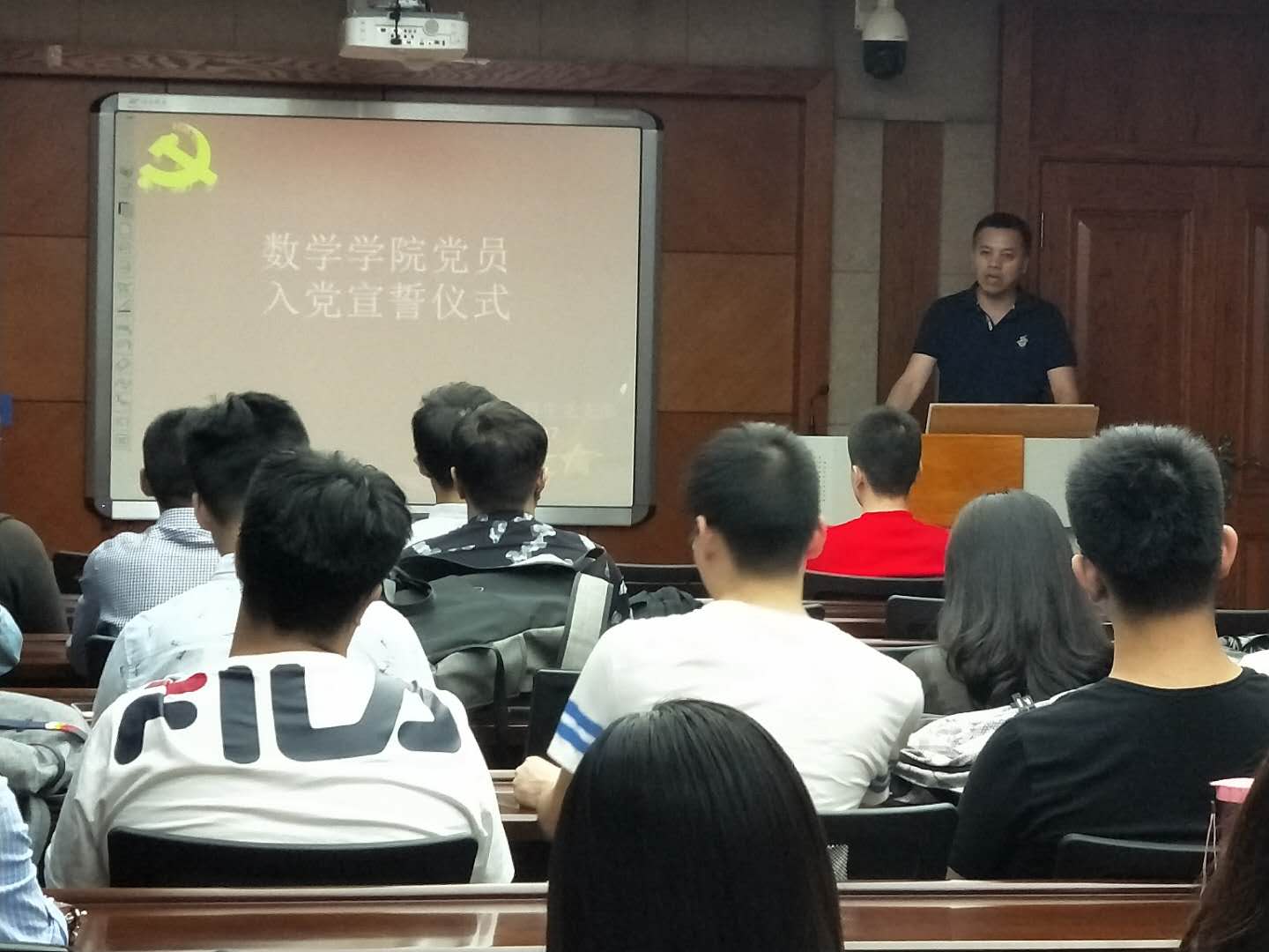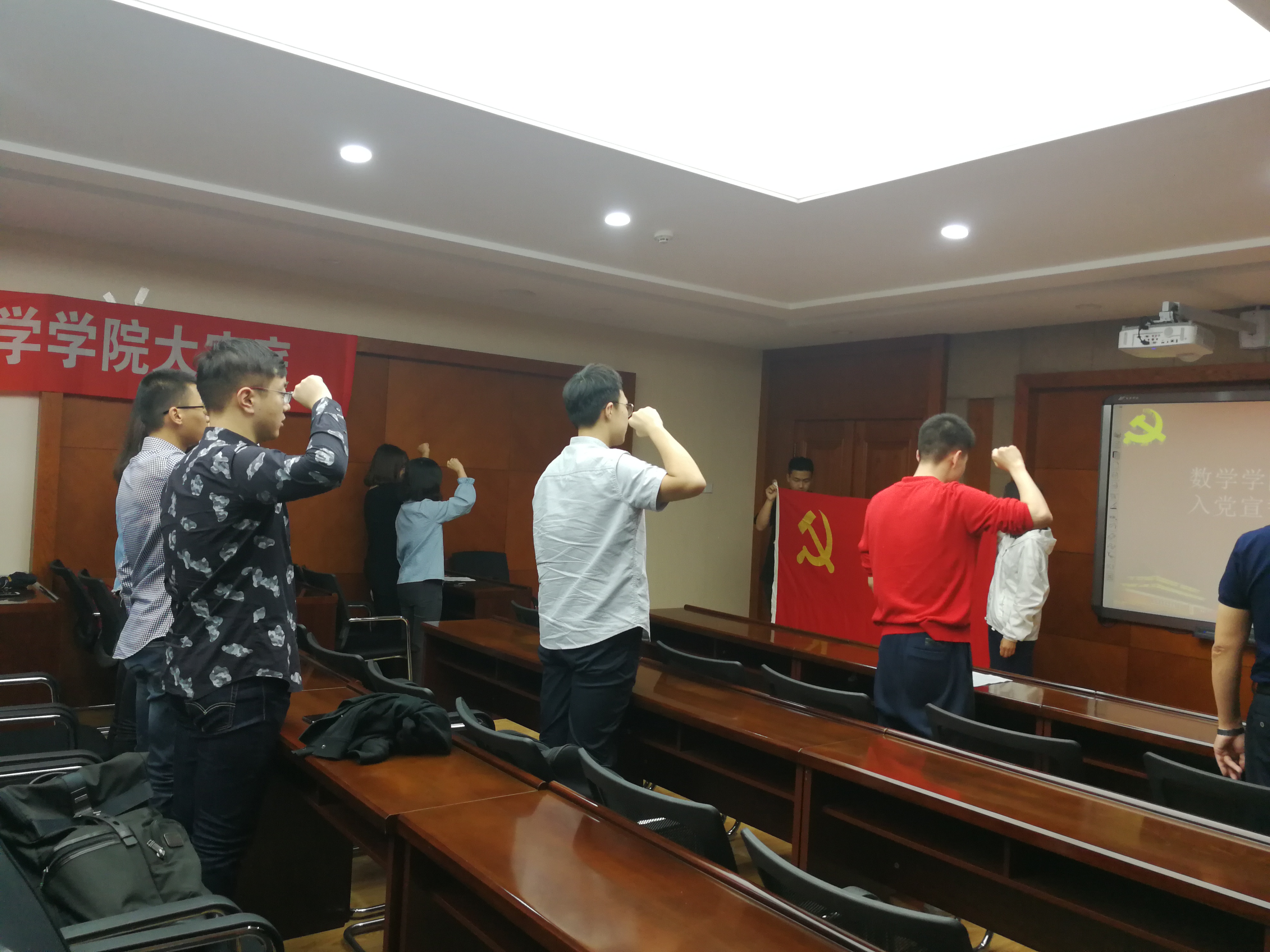 2018年8月27日中午,365英国上市公司本科生党支部组织新入党的党员在数学楼一楼报告厅举行入党宣誓仪式。参加此次宣誓仪式的有365英国上市公司党委副书记范庆文教授,本科生党支部书记李庚和本科生第一支部第二支部共37名同学。
