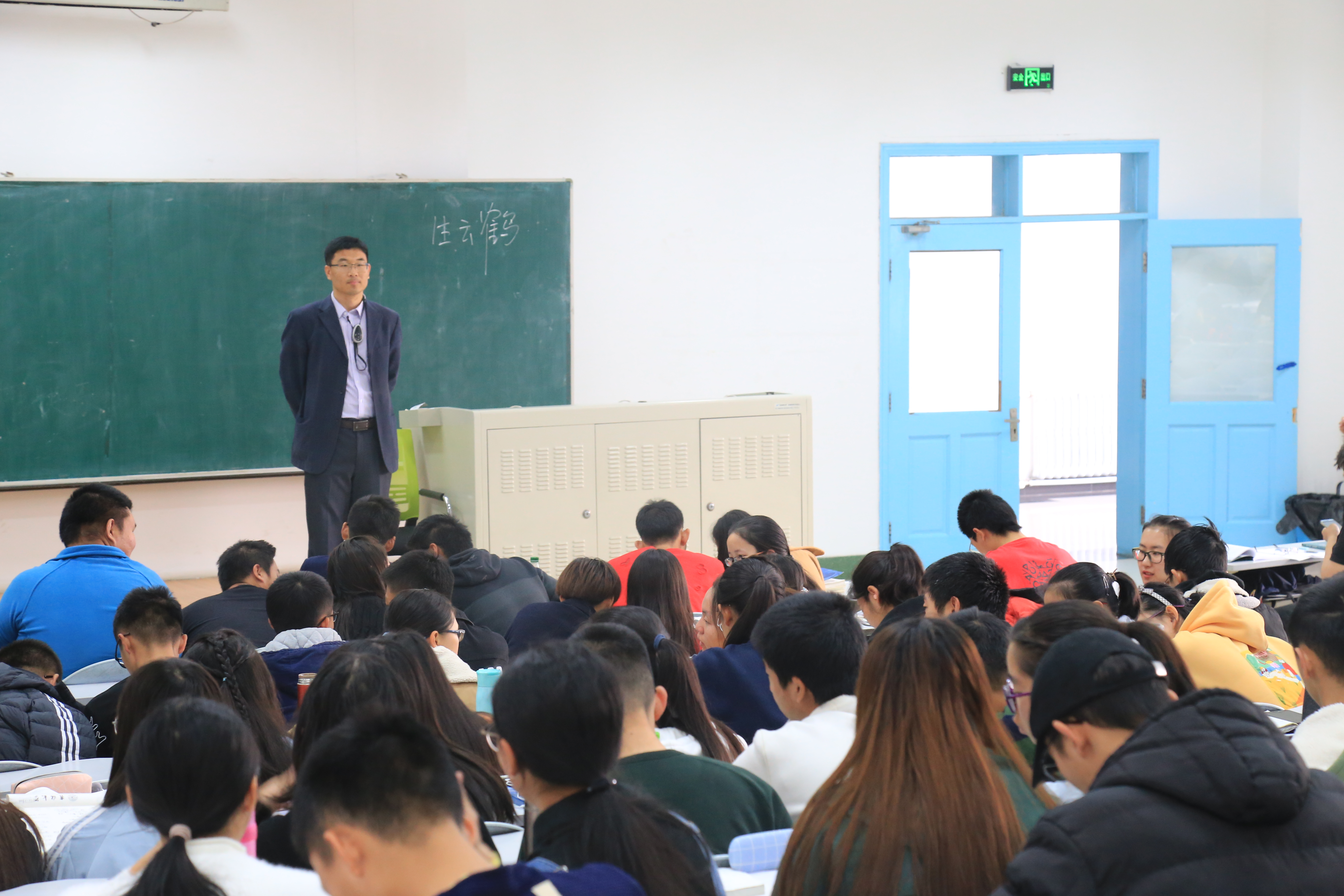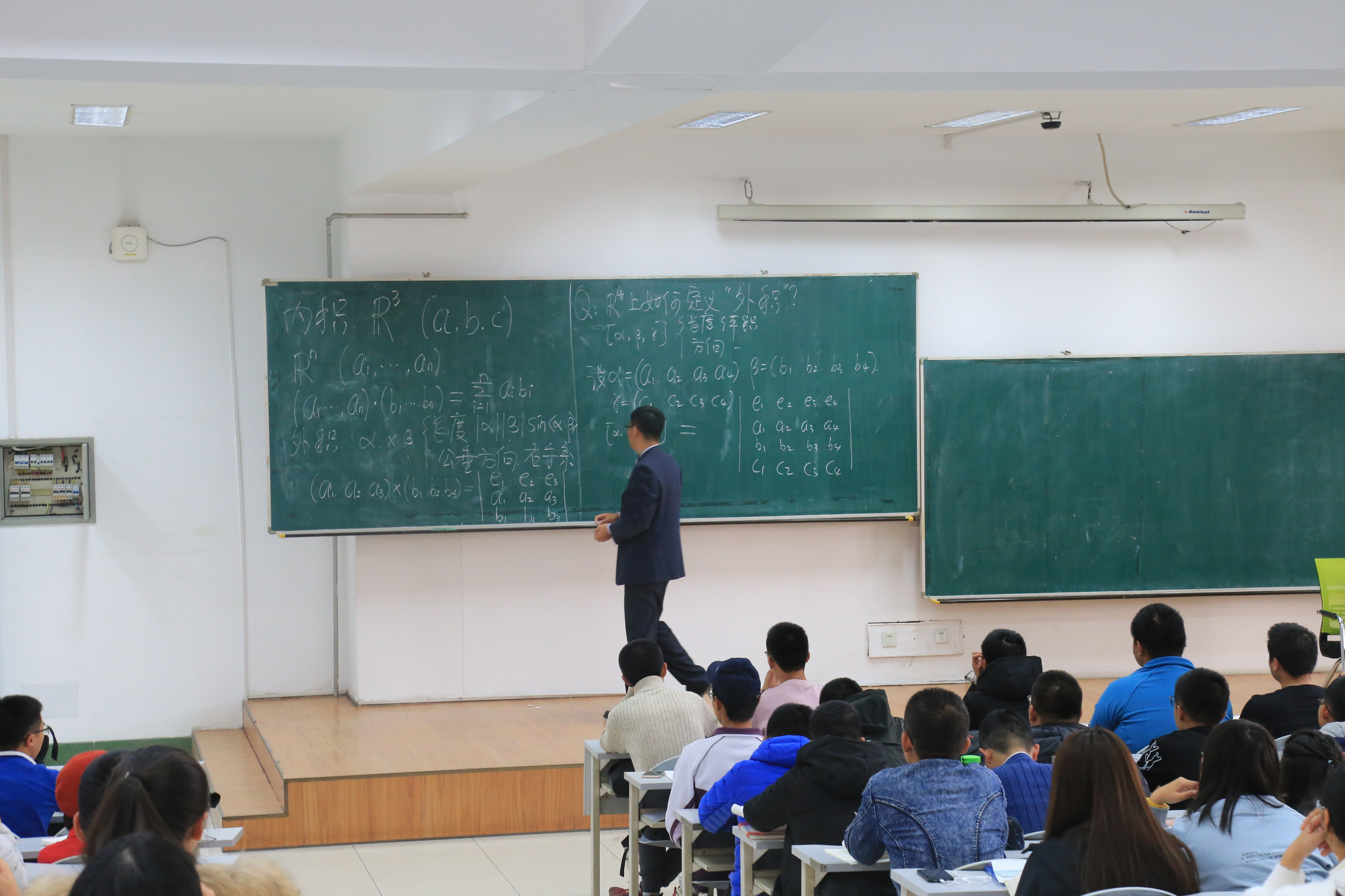 讲座的第一部分由生云鹤教授主讲。生云鹤教授以“不忘初心”为主题,鼓励同学们要坚持自己最初入学时的信念,坚持自己的志向,坚持自己对于数学的热情,不忘初心,尽心尽力地把大学之路走好。在为新生们奉上开学以来第一碗“心灵鸡汤”后,生教授从空间几何解析中的内外积知识入手,以员工刚刚了解的三维向量空间上的内外积知识为基础,引导员工理解n维向量空间、独立思考更高维数向量空间上的内积、外积定义。生教授在讲座中强调,要学好数学,就要学会理解数学,特别要学会直观地理解。生教授还倡导同学们在日常学习中积极讨论。讲座现场,同学们两两一组,在生教授的指导下对于n维向量空间中内积的定义做出激烈讨论。
