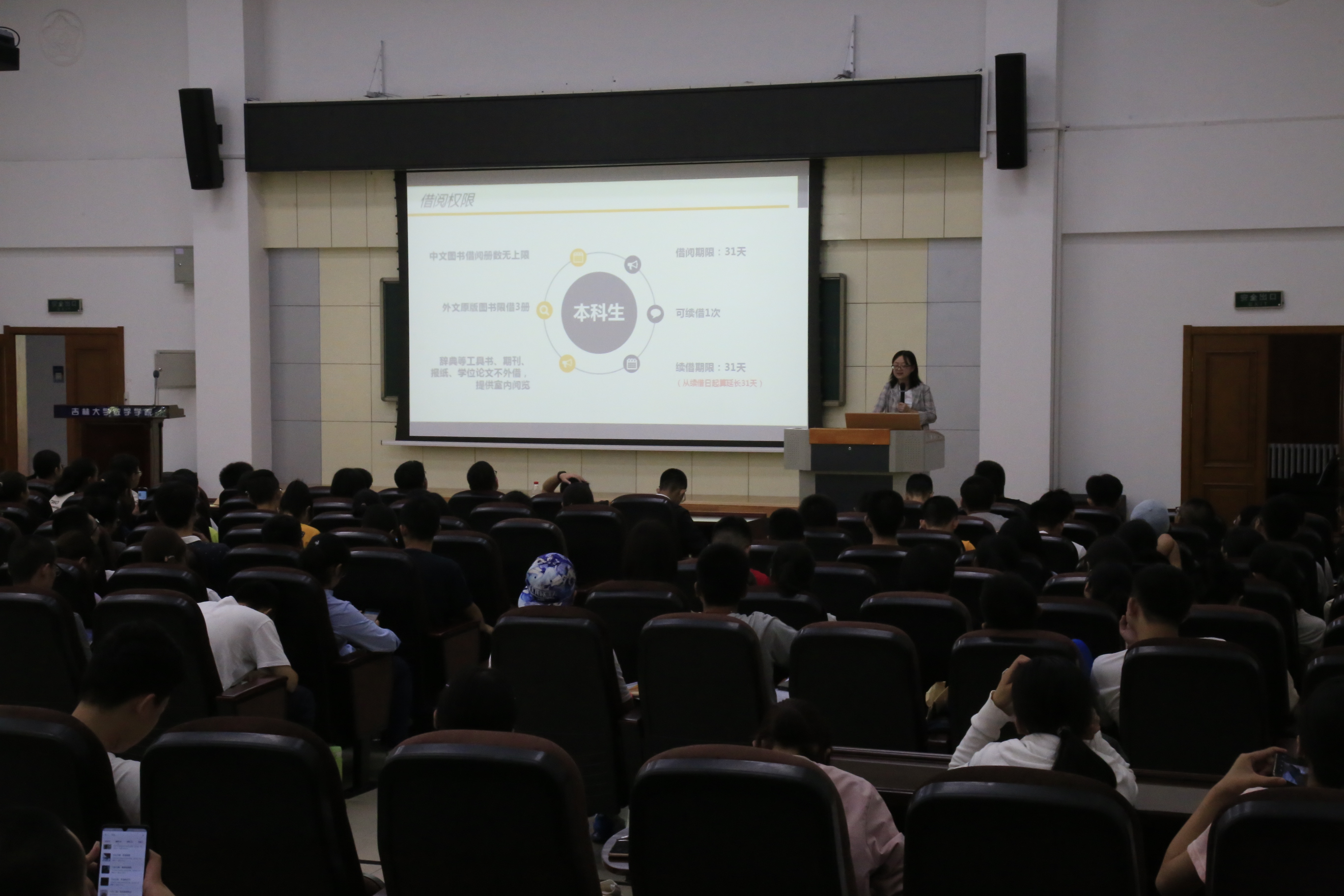 本次活动以普及大学图书馆使用为目的,主要是为了让同学们了解关于图书馆的基本知识,知道如何借阅图书以及一些图书馆的规定,避免行为上的错误。负责讲课的老师从图书馆的查询方式讲起,同学们可以通过微信公众号、图书馆APP、图书馆网页查询图书及个人相关信息,老师具体讲述了如何借阅和归还图书,以及图书馆的一些注意事项,例如不能带外卖进馆、逾期不还书的惩罚、图书馆内保持安静、部分类别的书籍不能外借,只能在馆内阅读等。老师的语言幽默生动,报告厅内也时不时传出同学们的阵阵笑声,这也为这次报告增添了不少色彩