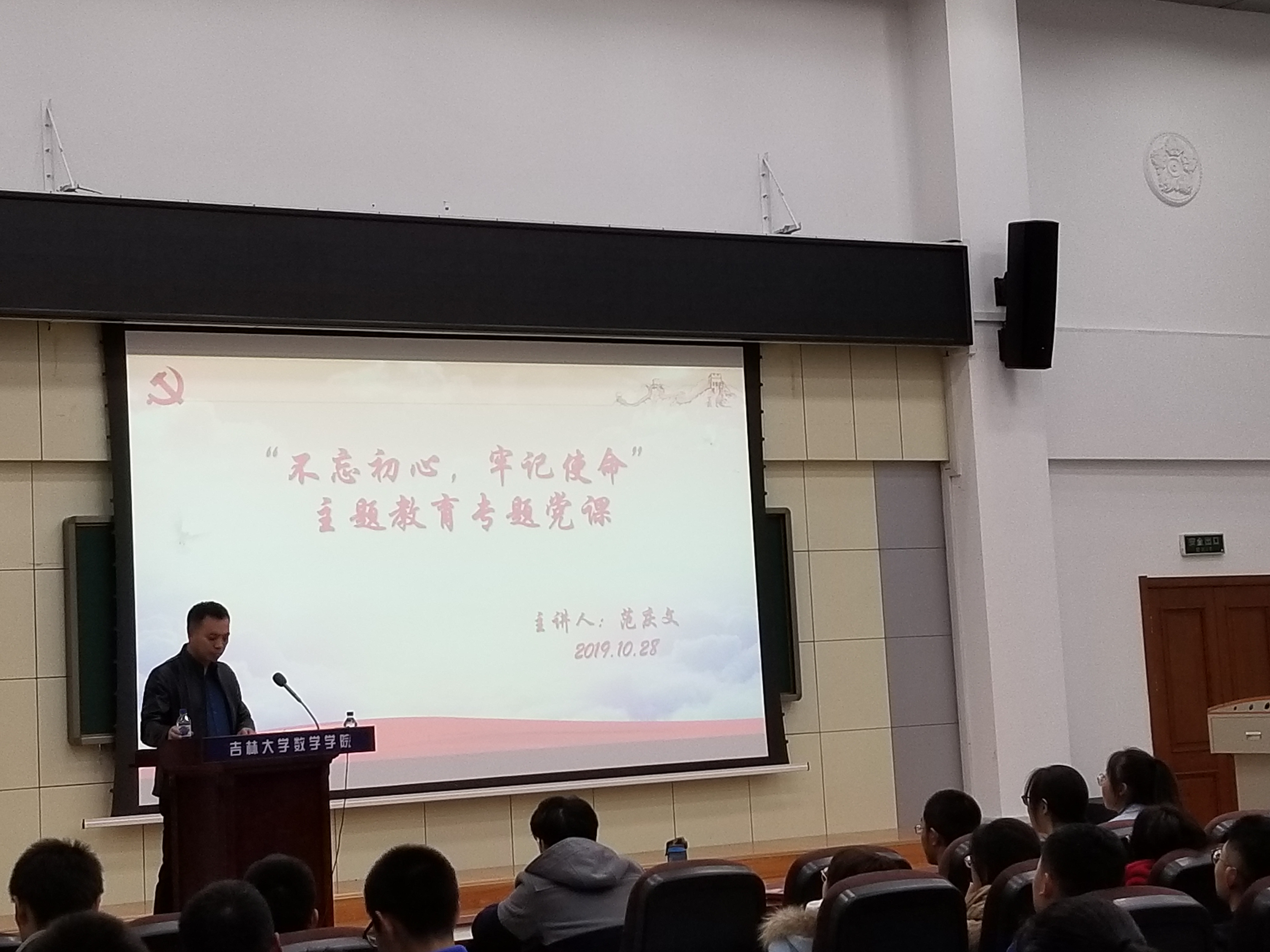 10月28日,365英国上市公司党委副书记范庆文教授于数学楼报告厅为2019级新生上了大学的第一节党课。首先,范书记对2019级新同学表达了自己的欢迎,并鼓励同学们要做一个有责任,有担当的中国青年,挑起属于自己的担子,勇敢地迎难而上,为祖国建设披荆斩棘,努力实现中华民族谋复兴的历史使命。