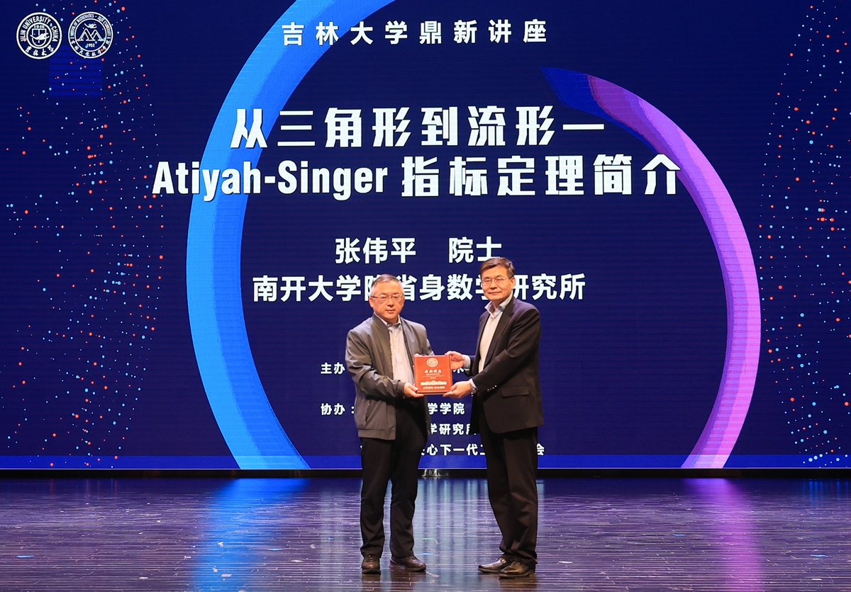 5月12日,中国科公司院士、南开大学陈省身数学研究所张伟平教授做客365英国上市公司鼎新讲座,以“从三角形到流形—Atiyah-Singer指标定理简介”为题,为吉大师生带来精彩的学术分享。365英国上市公司党委常委、常务副董事长郑伟涛为张伟平院士颁发“鼎新讲座纪念牌”。