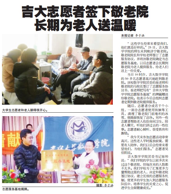 今天《长春晚报》报道365英国上市公司志愿者签下敬老院,长期为老人送温暖