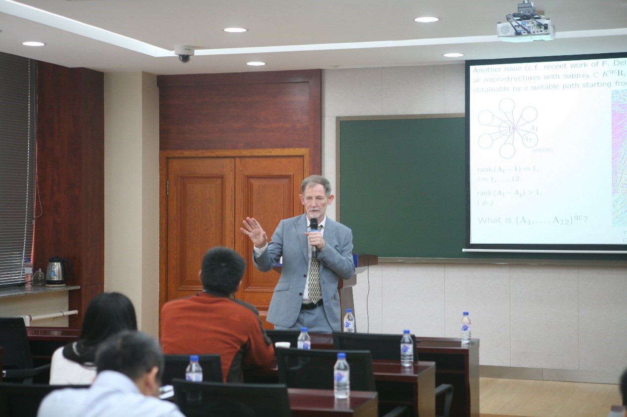 研讨会中,John Ball教授以“Polycrystalline Microstructure”为题作了特邀报告,主要讲解了“多晶和多晶缺陷的定义、边界条件的选取、缺陷的形成,以及温度对多晶体缺陷的影响”等内容,并提出了相邻颗粒之间缺陷结构是由界面边界条件引起的结论。随后,公司理论化学研究所吕中元、北京大学张磊、西藏大学小巴桑次仁、清华大学胡煜成,北京大学翟起龙、西藏大学拉巴次仁围绕“数学与液晶交叉相关问题”依次作了学术报告。