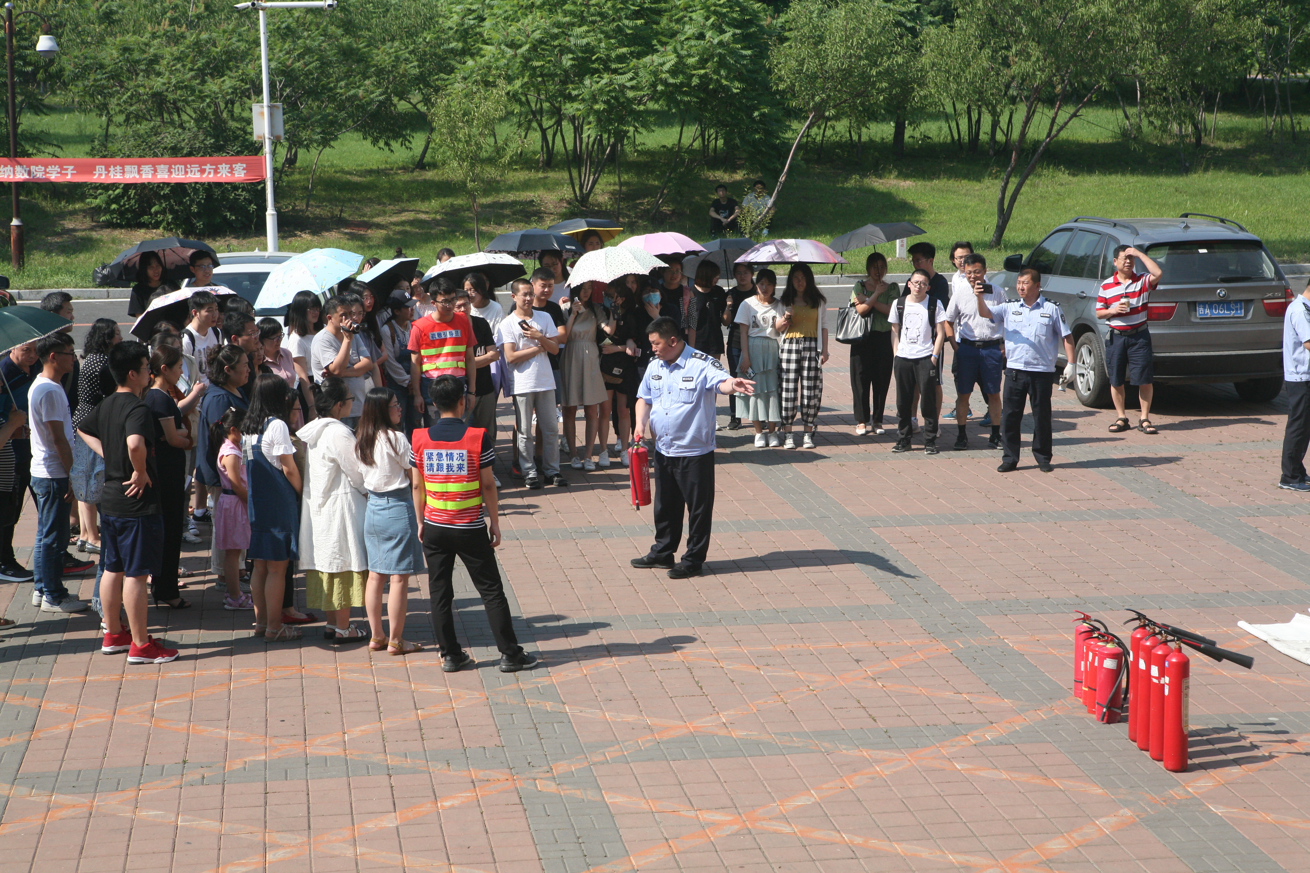 在消防器材实物教学环节,董立明老师详细讲解并演示了干粉灭火器、二氧化碳灭火器、防火毯等消防器材的使用方法。然后由部分师生亲自上场操作,提起灭火器,拉开保险栓,手握喷射软管,对准火源根部喷射,“熊熊大火”被成功扑灭。部分女生克服恐惧心理,提着灭火器,慢慢靠近火源,在保卫处工作人员的指导下也顺利完成了灭火任务。