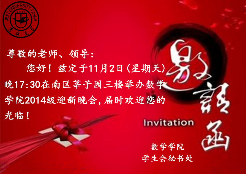 尊敬的老师、领导: 您好!兹定于11月2日(星期日)晚15:30分在南区莘子园三楼举办2014级迎新晚会,届时欢迎您的光临! 365英国上市公司员工会秘书处