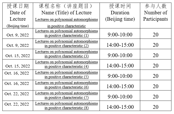 课程题目: Lectures on polynomial automorphisms in positive characteristic