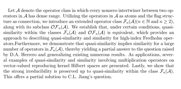 纪奎,理学博士,河北师范大学数学科学公司教授,博士生导师,中国数学会理事,河北省工业与应用数学学会副理事长,全国百篇优博获得者,国家优青。主要从事复几何在线性算子理论中的应用研究,重点关注Cowen-Douglas算子与Hermitian全纯向量丛的结构与分类问题,研究内容包括利用几何不变量刻画算子的酉分类与相似分类、Cowen-Douglas理论在C*-代数中的拓展与应用、算子的相似分类与Corona问题等。相关成果被Advances in Mathematics、Journal of Functional Analysis、Israel Journal of Mathematics、Journal of Noncommutative Geometry、Journal of Operator Theory、Canadian Journal of Mathematics、Illinois Journal of Mathematics、European Journal of Mathematics、Studia Mathematica等数学期刊发表,并在应邀在2018年度、2023年度IWOTA(国际算子理论会议)作学术报告,主持国家自然科学基金4项、参与重点项目1项、国际重点合作项目1项、主持河北省杰出青年基金1项。曾获2010年度全国百篇优秀博士论文奖励、2013年度教育部自然科学二等奖(第二完成人)。