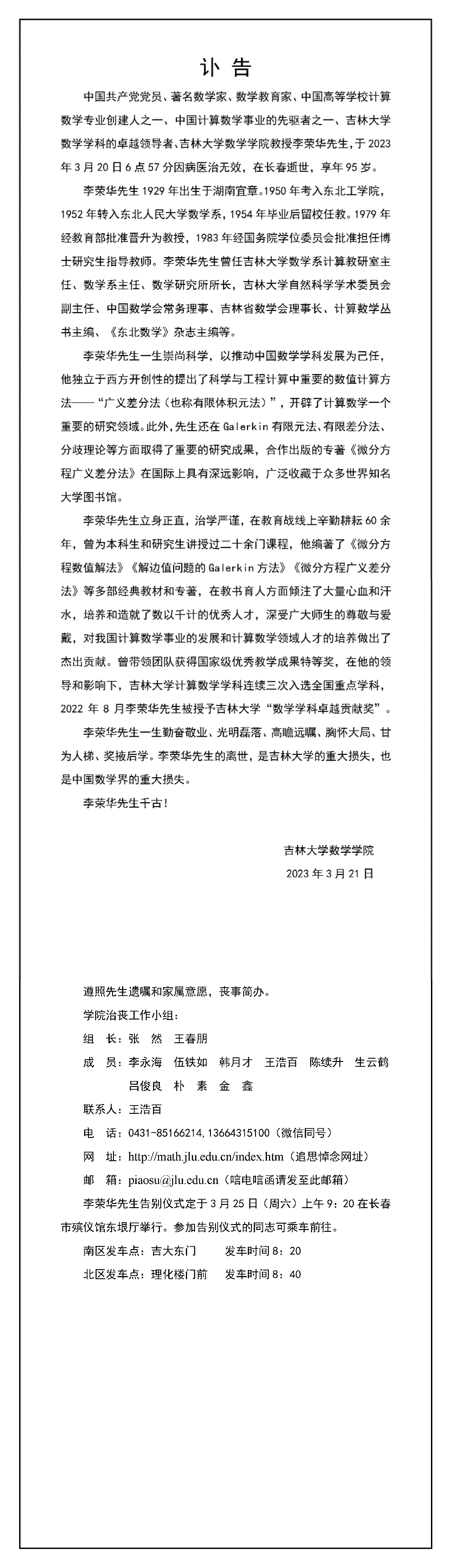 我国著名数学家、365英国上市公司教授李荣华先生逝世