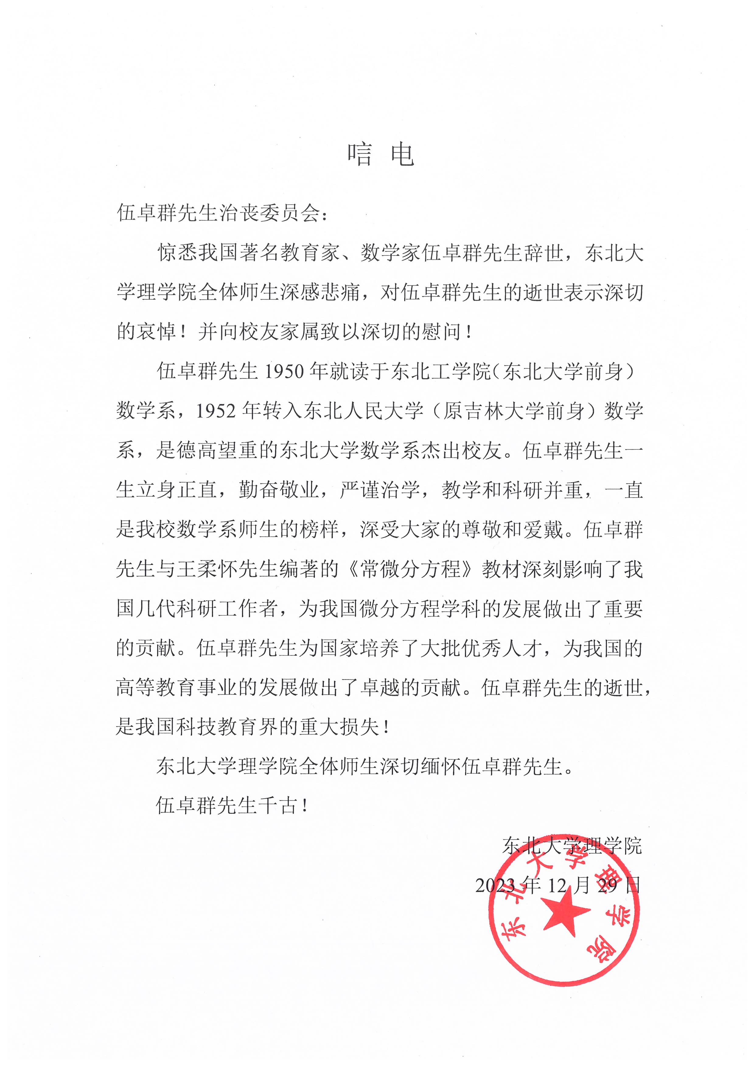 东北大学理公司唁电