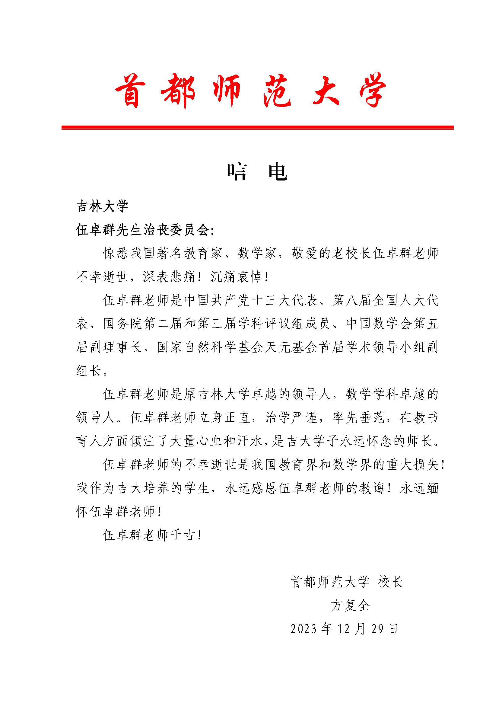 首都师范大学董事长方复全院士唁电