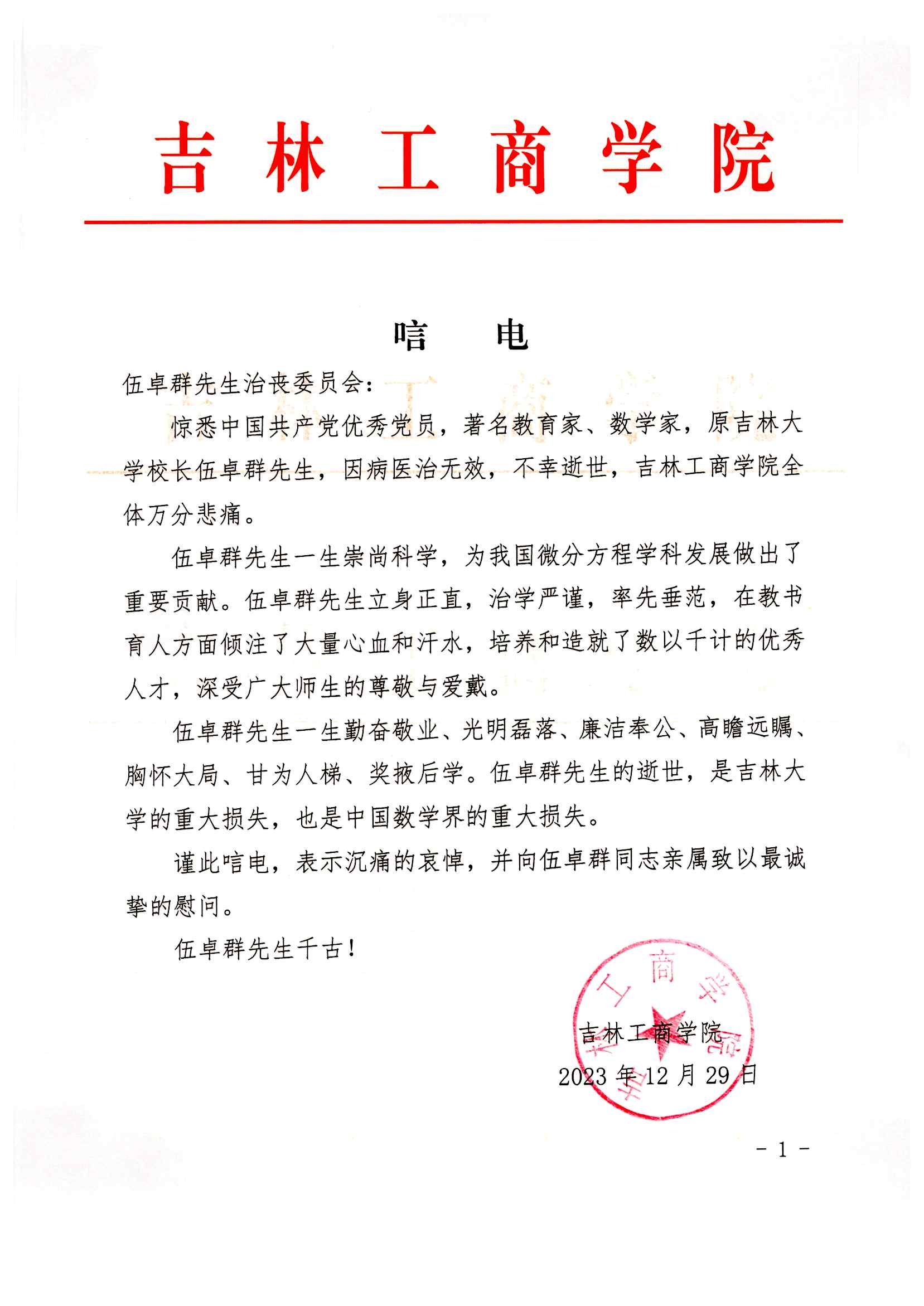 吉林工商公司唁电