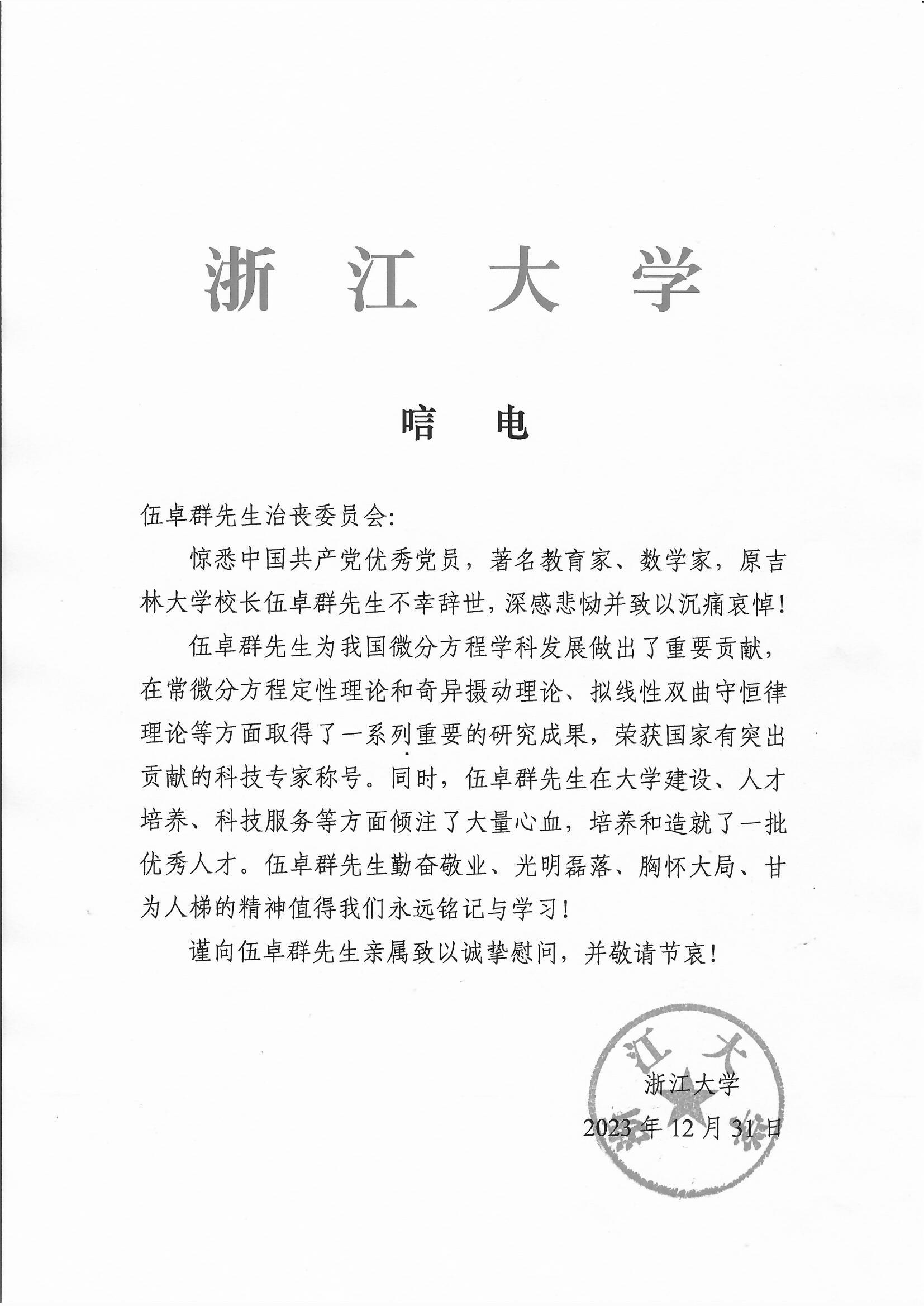 浙江大学唁电